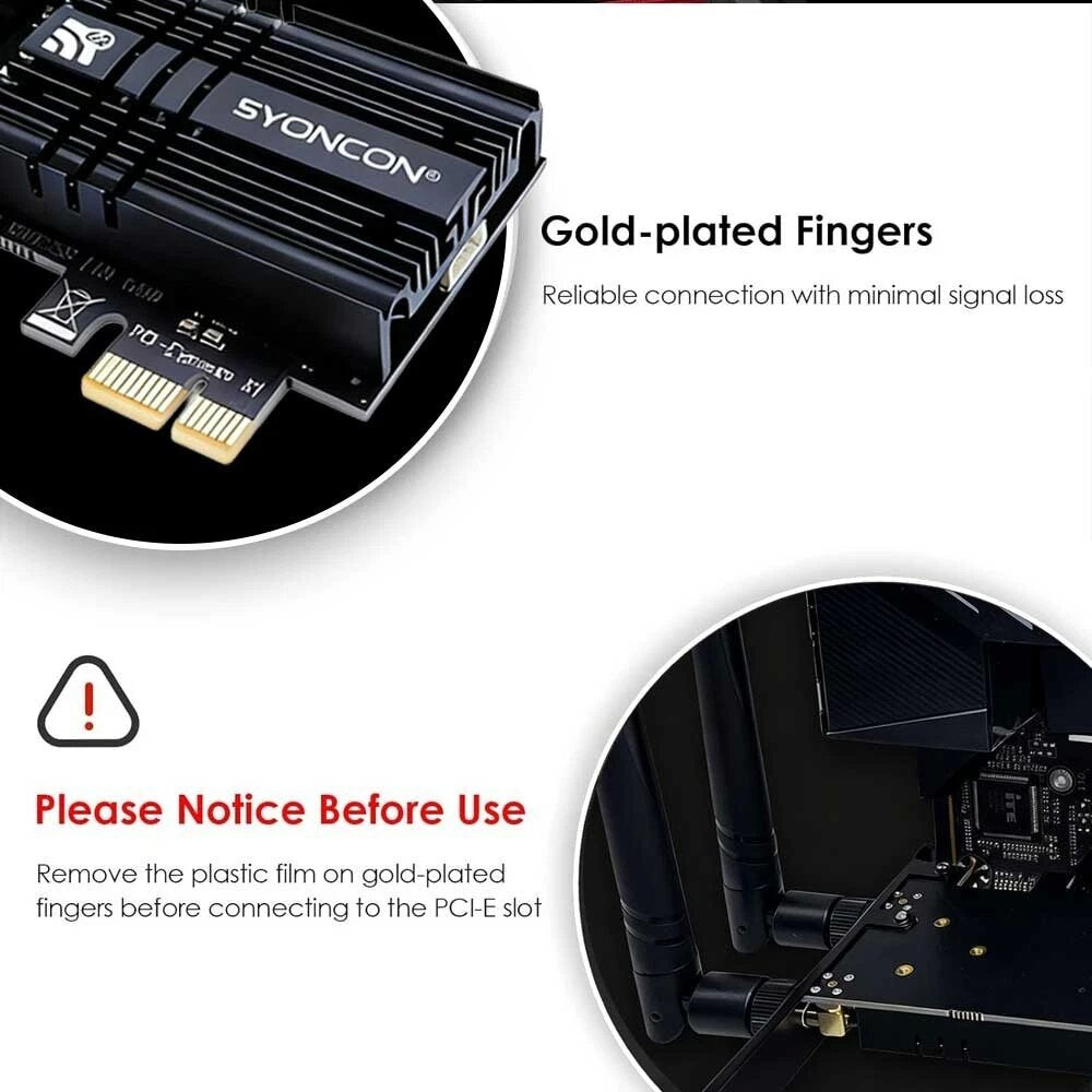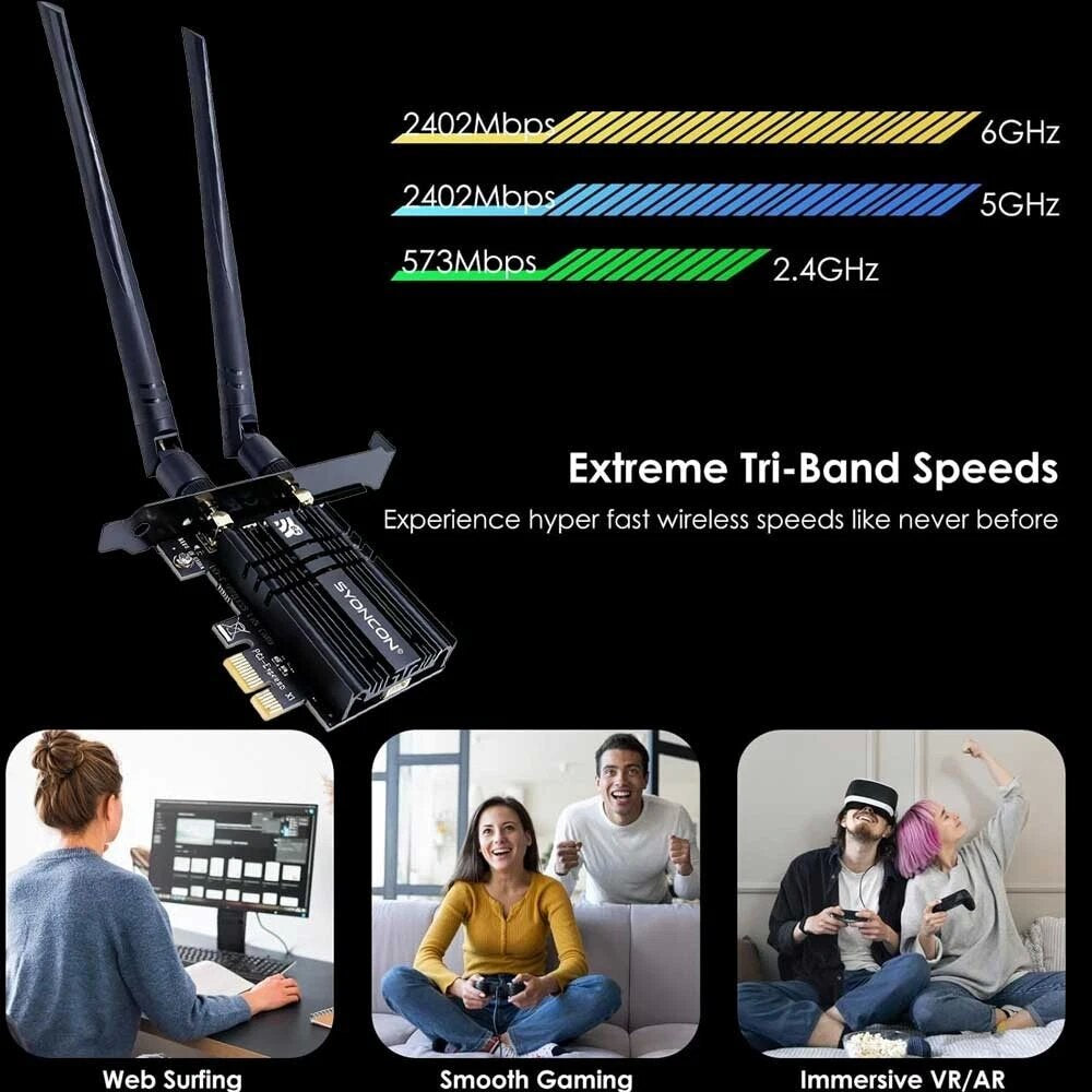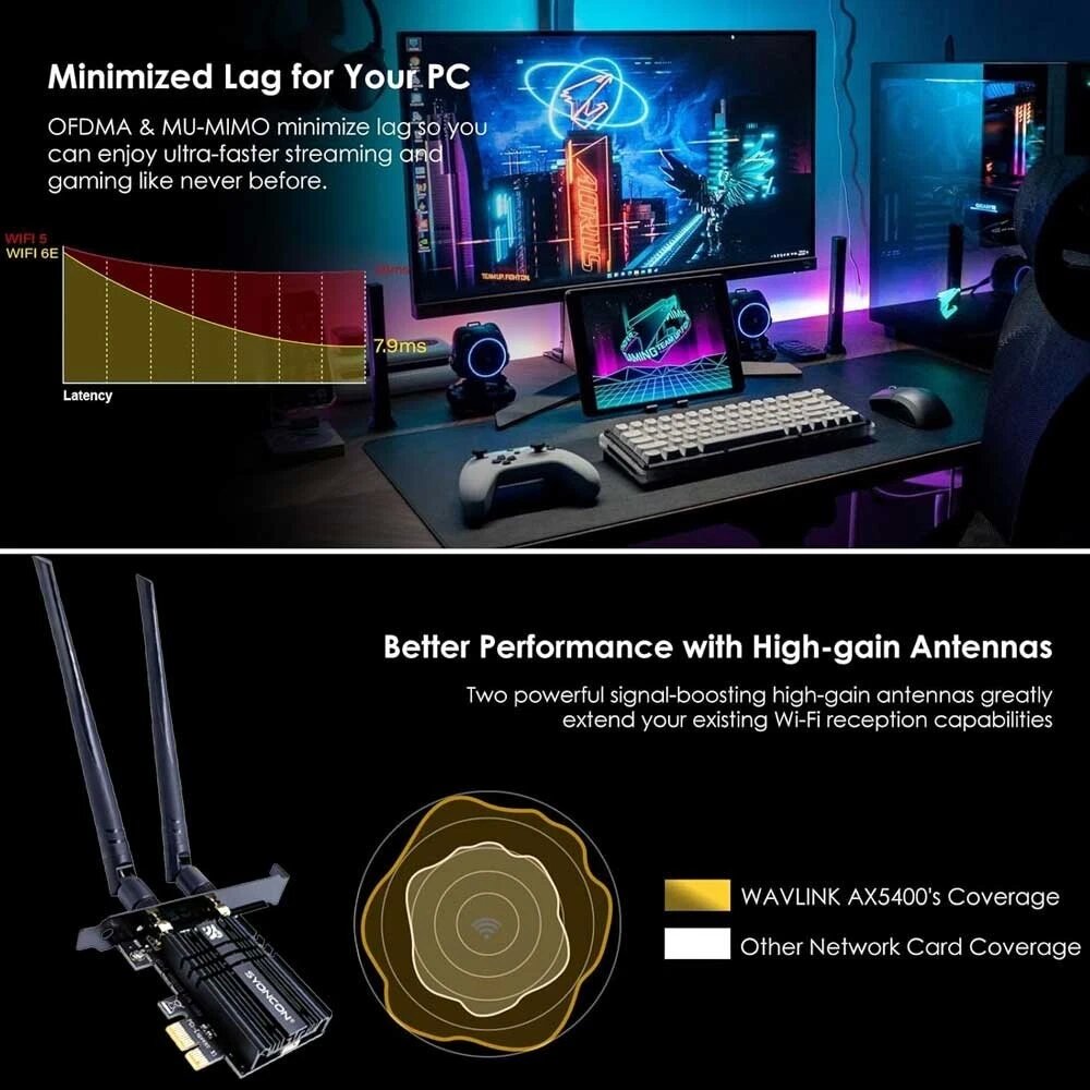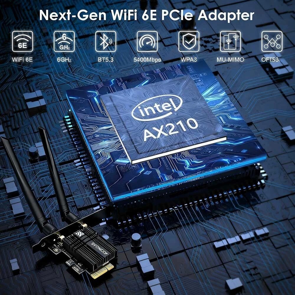 Elevate your network experience with this high-performance WiFi 6E Network Card, designed to deliver exceptional speed, stability, and security for all your online activities. Whether you're immersed in 4K streaming, competitive gaming, fast file downloads, or using VR devices, this network card ensures a seamless, lag-free connection even in dense or congested network environments. Powered by the advanced Intel AX210 chipset, it unlocks the potential of the 6GHz band, expanding your WiFi capabilities beyond traditional dual-band solutions. Additionally, it features the latest Bluetooth 5.3 technology for enhanced wireless device connectivity and supports the WPA3 security protocol to keep your network safe from hackers and malware. Compatible with a wide range of systems and PCIe slots, it’s the perfect upgrade to boost your desktop PC’s network performance.